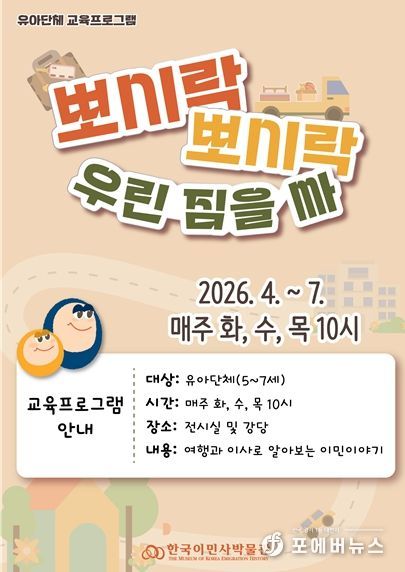 [ 포에버뉴스 김경순 기자 ] 인천광역시 한국이민사박물관은 유아 단체교육 '뽀시락 뽀시락 우린 짐을 싸'를 운영한다고 밝혔다.