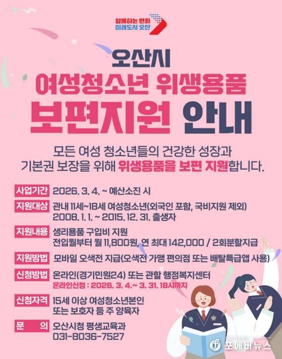 [ 포에버뉴스 김경순 기자 ] 오산시는 관내 11세부터 18세까지의 여성청소년을 대상으로 '여성청소년 위생용품 보편지원 사업'을 추진한다고 밝혔다.