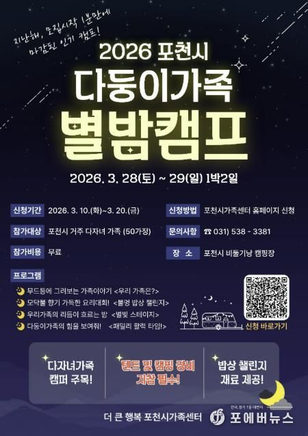 [ 포에버뉴스 김경순 기자 ] 포천시 더 큰 행복 포천시가족센터는 다자녀 가족의 가족 친화 문화 참여 기회를 확대하고 가족 간 교류 활성화를 지원하기 위해 ‘2026 포천시 다둥이가족 별밤 캠프’ 참여 가족을 모집한다.
