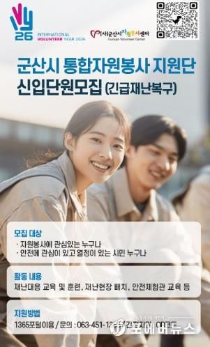 [ 포에버뉴스 이승훈 기자 ] 군산시자원봉사센터는 각종 자연·사회 재난 발생 시 신속하고 체계적인 현장 지원을 위해 ‘통합자원봉사지원단’을 오는 4월 26일까지 모집한다고 밝혔다.