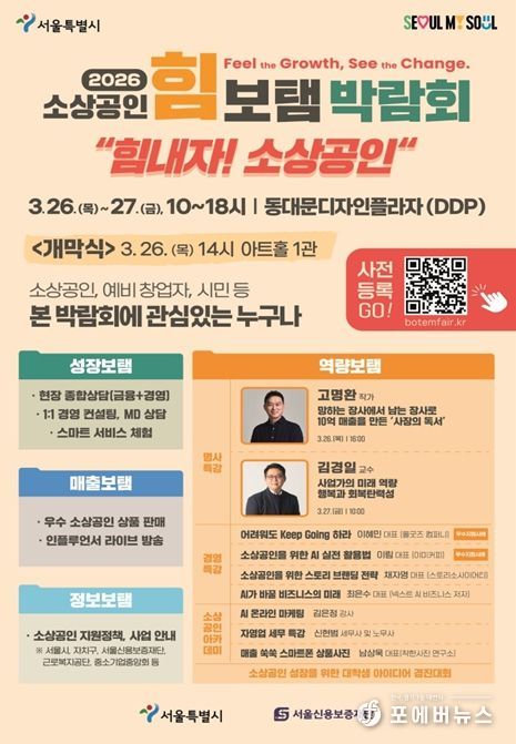 [ 포에버뉴스 사공선 기자 ] 서울시와 서울신용보증재단은 3월 26일부터 27일까지 이틀간 동대문디자인플라자(DDP)에서 ‘2026 소상공인 힘보탬 박람회’를 개최한다. 서울시 첫 소상공인 종합박람회로 금융·판로·교육 등 소상공인에게 필요한 정책과 정보를 총망라한 체험형 행사다.