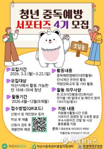 익산시는 중독관리통합지원센터에서 만 18~39세 청년을 대상으로 오는 22일까지 '청년 중독 예방 서포터즈 4기'를 모집한다고 13일 밝혔다.