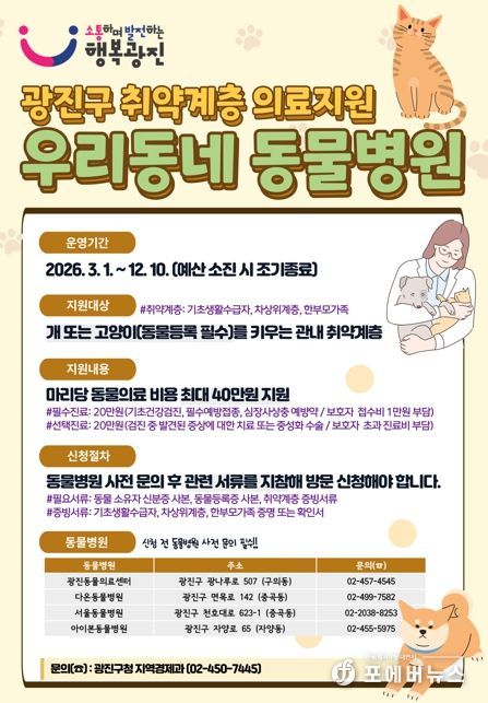 김경호 광진구청장은 “반려동물은 주민들에게 정서적 안정과 위로를 주는 소중한 가족이지만 경제적 이유로 제때 진료를 받지 못하는 경우가 많다”며 “이번 ‘우리동네 동물병원’을 통해 취약계층 반려동물이 기본 건강관리와 필요한 진료를 받을 수 있도록 지원하겠다”고 말했다.