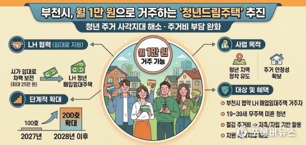 이에 부천시는 LH와 협력해 ‘청년드림주택’ 모델을 구상하고 있다. 지원 기간은 최대 2년으로, 청년이 절감한 주거비를 저축이나 자립 기반으로 활용하도록 돕는 것이 핵심 취지다.