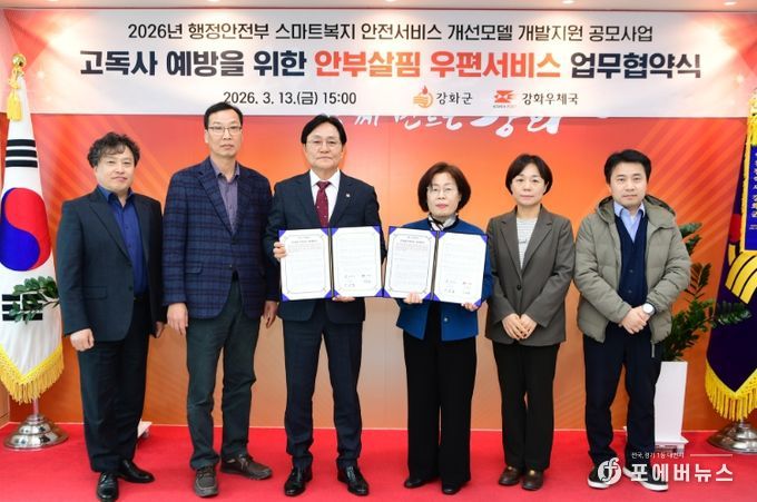 [ 포에버뉴스 김경순 기자 ] 강화군과 강화우체국이 지난 13일 고독사 예방과 복지안전망 강화를 위해 ‘안부 살핌 우편서비스’ 업무협약을 체결했다.