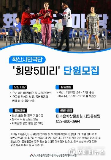[ 포에버뉴스 김경순 기자 ] 인천 미추홀구 미추홀학산문화원은 위탁 운영하는 학산 생활문화센터는 오는 24일까지 2026년 학산 시민극단 ‘희망5미리’의 단원을 모집한다고 밝혔다.