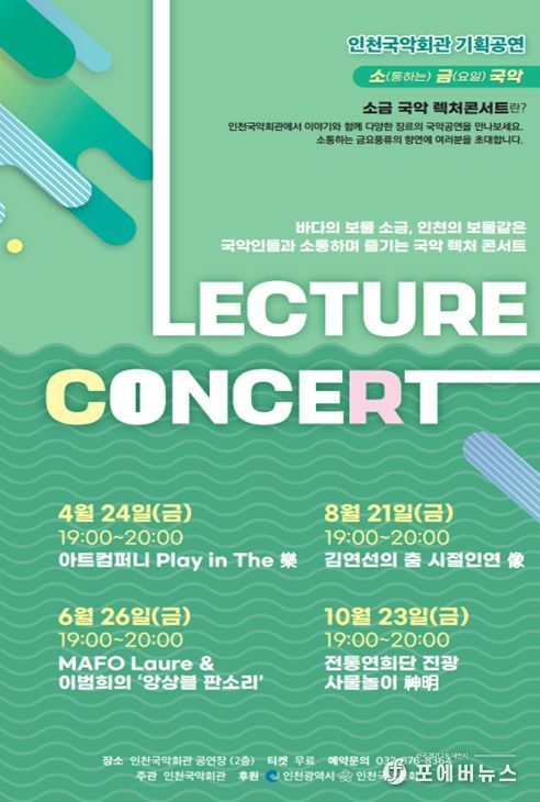 [ 포에버뉴스 김경순 기자 ] 공연과 이야기가 함께하는 국악 무대가 인천 시민들을 찾는다. 인천광역시는 시민들이 국악을 쉽고 흥미롭게 즐길 수 있도록 ‘2026 소(통하는) 국악 렉처 콘서트’를 올해 총 4회에 걸쳐 개최한다고 밝혔다.