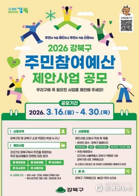[ 포에버뉴스 김경순 기자 ] 서울 강북구가 구민의 다양한 의견을 구정에 반영하기 위해 오는 4월 30일까지 ‘2026년 강북구 주민참여예산 제안사업’을 공모한다.