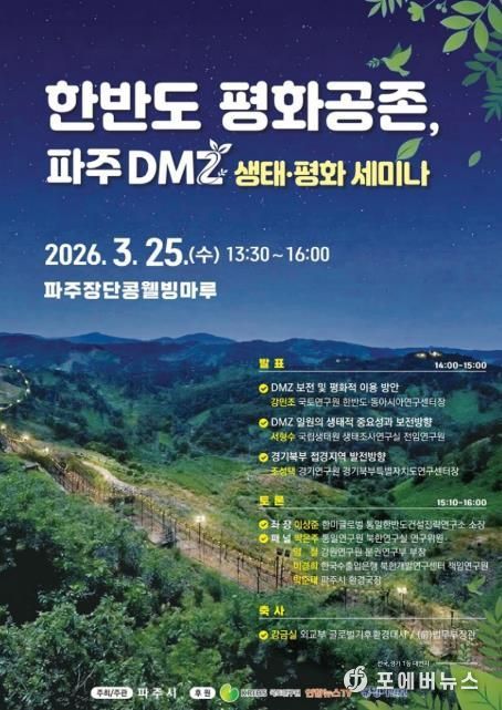 [ 포에버뉴스 김경순 기자 ] 파주시는 오는 25일 13시부터 16시까지 파주장단콩웰빙마루(탄현면 필승로 396) 2층에서 ‘한반도 평화공존, 파주 디엠지(DMZ) 생태·평화 세미나’를 개최한다.