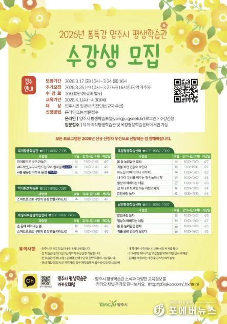 [ 포에버뉴스 김경순 기자 ] 양주시가 시민들의 자기계발과 여가 활용을 돕고자 ‘2026년 봄 특강’수강생을 모집한다.