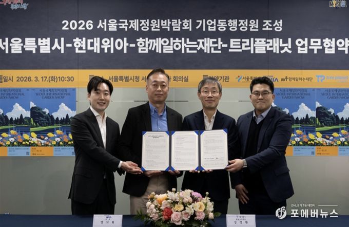 [ 포에버뉴스 김경순 기자 ] 서울시는 현대위아, 함께일하는재단, 트리플래닛과 5월 1일 개막하는 ‘2026 서울국제정원박람회’의 기업동행정원 업무협약(MOU)을 3월 17일 서울시청에서 체결했다.