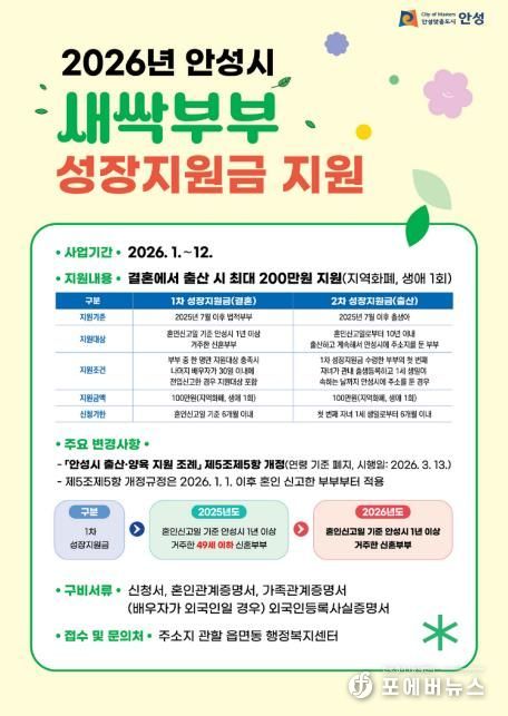 [ 포에버뉴스 김경순 기자 ] 안성시는 3월 13일'안성시 출산·양육 지원 조례'일부개정을 통해 새싹부부성장지원금 연령 기준(49세이하 신혼부부)을 폐지하여 지원 대상을 확대했다.