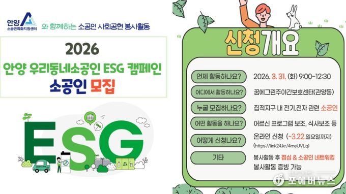 [ 포에버뉴스 김경순 기자 ] 안양산업진흥원은 오는 22일까지 소공인지원센터의 소공인 사회공헌 프로그램인 ‘2026 안양 우리동네소공인 ESG 캠페인’에 참여할 관내 소공인을 모집한다고 18일 밝혔다.