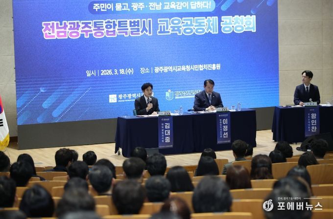 [ 포에버뉴스 오명숙 기자 ] 전라남도교육청‧광주광역시교육청은 18일 광주교육청 시민협치진흥원 대강당에서 지역 주민 의견 수렴을 위한 ‘전남광주통합특별시 교육공동체 공청회’를 개최했다.