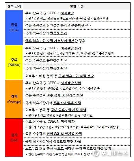 자원안보 위기경보는 ‘관심-주의-경계-심각’ 4단계로 운용되며, 「국가자원안보특별법」 제23조에 따라 위기 상황의 심각성, 국민생활 및 국가경제 파급력 등을 종합적으로 고려하여 발령한다.