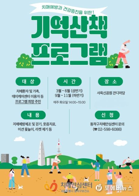 [ 포에버뉴스 김경순 기자 ] 동작구는 구민들의 치매 예방과 건강증진을 위해 걷기 기반 통합 건강관리 프로젝트 ‘기억산책’을 운영한다고 밝혔다.