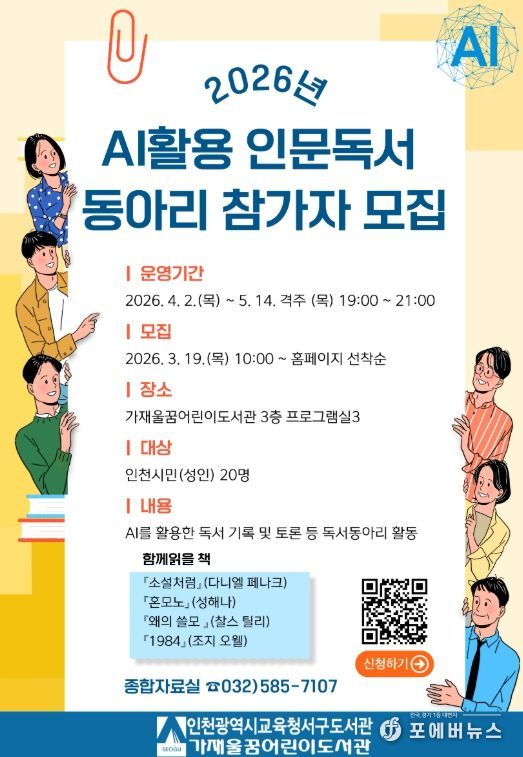 [ 포에버뉴스 김경순 기자 ] 인천광역시교육청서구도서관은 4월 2일부터 5월 14일까지 관내 성인을 대상으로 ‘AI 활용 인문독서 동아리’ 프로그램을 운영한다.
