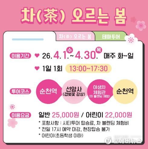 시 관계자는 “이번 ‘차(茶)오르는 봄’ 투어는 순천이 가진 천혜의 자연경관과 야생차(茶)라는 전통 콘텐츠를 산뜻하게 엮어낸 감성투어”라며, “꽃 향과 차 향이 어우러진 순천의 봄날이 순천을 찾는 상춘객들에게 진정한 위로와 휴식이 되길 기대한다”고 말했다.