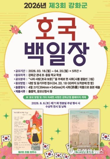 [ 포에버뉴스 김경순 기자 ] 강화군은 오는 4월 20일까지 관내 초·중학교 학생들을 대상으로 ‘2026년 제3회 강화군 호국 백일장 공모전’을 개최한다고 밝혔다.
