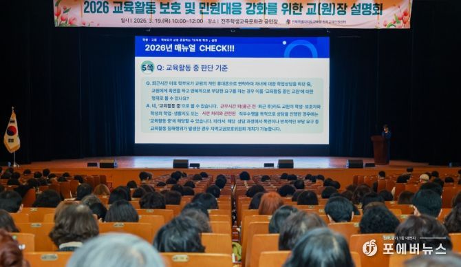 [ 포에버뉴스 이승훈 기자 ] 전북특별자치도교육청은 19일 전주학생교육문화관 공연장에서 2026년 교육활동 보호 및 민원대응 강화를 위한 학교(원)장 설명회를 개최했다.