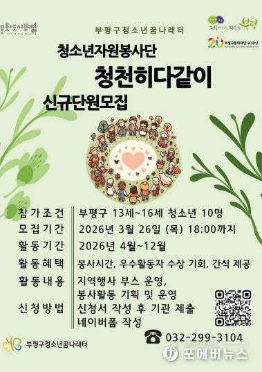 [ 포에버뉴스 김경순 기자 ] 부평구청소년꿈나래터는 오는 26일까지 2026년도 청소년자원봉사단 ‘청천히 다같이’ 단원을 신규 모집한다고 밝혔다.