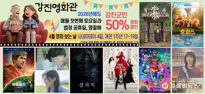 [ 포에버뉴스 오명숙 기자 ] 강진영화관이 군민이 더 쉽게 영화를 즐길 수 있도록 운영하는 ‘영화 보는 날’ 행사로 큰 호응을 얻고 있다. 지난해 4월 17일 문을 연 강진영화관은 개관 1주년을 앞둔 올해 3월 22일 기준 누적 관람객 3만 명을 넘어서며 군민들의 꾸준한 관심 속에 지역 문화공간으로 자리잡고 있다.