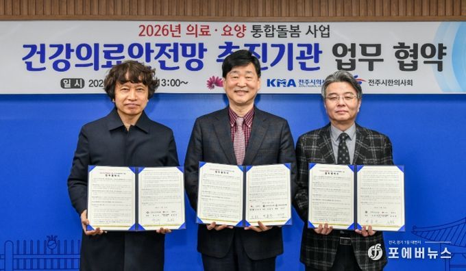 시와 전주시의사회(회장 박용현), 전주시한의사회(회장 박상구)는 24일 시청 3층 회의실에서 윤동욱 전주시장 권한대행 부시장과 박용현 전주시의사회장, 박상구 전주시한의사회장 등이 참석한 가운데 ‘2026 건강-의료안전망 사업 추진을 위한 업무협약’을 체결했다.
