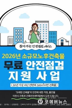 [ 포에버뉴스 김경순 기자 ] 이천시는 건축물 노후화로 인한 안전사고를 예방하고 시민 안전을 강화하기 위해 ‘2026년 찾아가는 소규모 노후건축물 안전점검 지원사업’을 추진한다고 밝혔다.