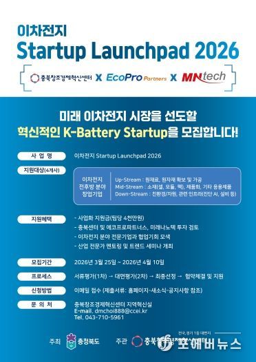 [ 포에버뉴스 사공선 기자 ] 충북도가 이차전지 혁신 기술을 보유한 스타트업을 발굴해 육성하는 '이차전지 스타트업 육성 플랫폼 구축 지원사업(이차전지 Startup Launchpad 2026)' 참여 기업을 4월 10일까지 모집한다.