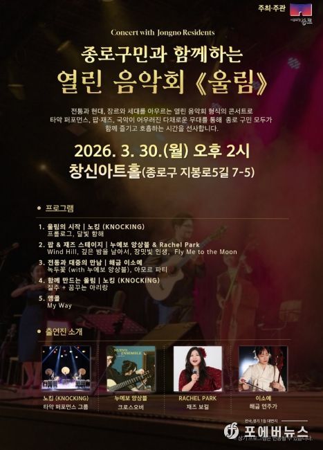 [ 포에버뉴스 김경순 기자 ] 종로구가 봄을 맞아 도심 곳곳을 문화의 온기로 채울 무료 음악 공연을 선보인다.