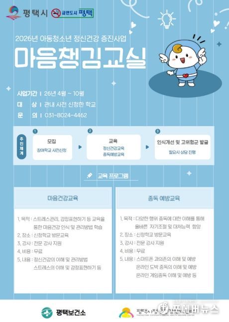 [ 포에버뉴스 김경순 기자 ] 평택시는 스쿨케어 사업의 일환으로 관내 학교 학생들을 대상으로 『마음챙김교실』을 운영한다고 밝혔다. 이번 프로그램은 학생들이 교육을 통해 정신건강을 올바르게 인식하고 스스로 관리할 수 있도록 지원함으로써 마음 건강 증진을 도모하는 데 목적이 있다.