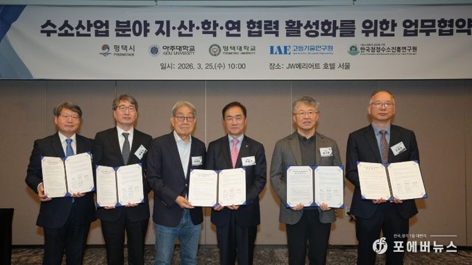[ 포에버뉴스 김경순 기자 ] 평택시는 25일, 아주대학교·평택대학교·고등기술연구원·한국청정수소진흥연구원과 '수소산업 분야 지산학연 협력 활성화를 위한 업무협약(MOU)'을 체결했다고 밝혔다.