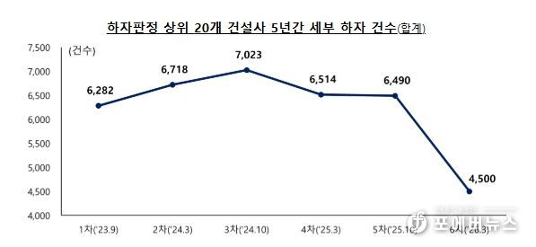 최근 5년(’21.3~’26.2) 누계 기준으로는, (주)순영종합건설(383건, 세부 하자수 기준), (주)대명종합건설(318건), 에스엠상선(주)(311건), 제일건설(주)(299건), (주)대우건설(293건) 순으로, 대형 건설사의 세부 하자 수 감소에 따라 그간 1차 발표(’23.9)부터 유사했던 상위 건설사 순위가 금번 발표 시 크게 변동된 것으로 나타났다.
