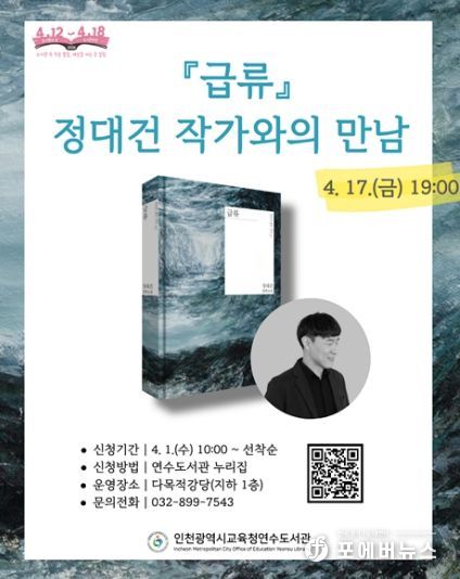 [ 포에버뉴스 김경순 기자 ] 인천광역시교육청연수도서관은 4월 17일 도서관 다목적강당에서 지역 주민을 대상으로 소설 '급류'의 저자 ‘정대건 작가와의 만남’을 운영한다고 밝혔다.