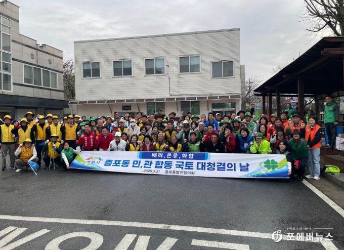 [ 포에버뉴스 김경순 기자 ] 증포동은 지난 31일 깨끗한 마을환경 조성을 위해 증포동 일원에서 ‘민․관 합동 환경정화 활동’을 실시했다고 밝혔다.