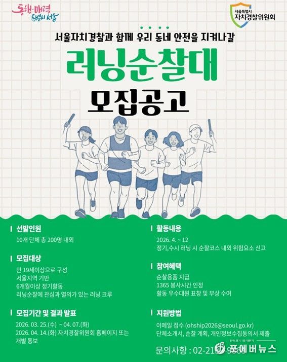 [ 포에버뉴스 김경순 기자 ] 서울시 자치경찰위원회는 러닝을 하며 동네 안전까지 함께 살피는 시민 참여형 활동인 서울 러닝 순찰대에 참여할 2026년 신규 대원을 모집한다. 올해는 10개 단체(크루) 200명 규모로 확대해 운영할 계획이다.