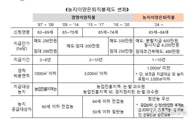 농식품부 강동윤 농촌소득에너지정책국장은 “이번 제도 개선은 고령 농업인의 현실적인 영농 여건을 반영한 것”이라며, “앞으로도 안정적인 노후소득 보장과 함께 원활한 영농 세대교체가 이루어질 수 있도록 제도를 지속적으로 보완해 나가겠다”고 밝혔다.