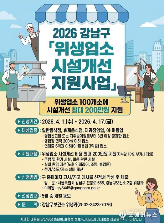 조성명 강남구청장은 “위생업소의 시설개선은 영업환경은 물론 이용 만족도와 업소 경쟁력에도 직결되는 중요한 부분”이라며 “현장에서 체감할 수 있는 지원을 통해 소상공인의 부담을 덜고 안정적인 영업 기반을 마련할 수 있도록 힘쓰겠다”고 말했다.