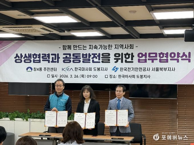 협약식에는 오청은 창4동장, 정승기 한국마사회 도봉지사장, 김창수 한국전기안전공사 서울북부지사장이 참석해 상호협력을 약속했다.