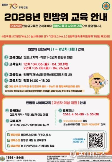 [ 포에버뉴스 김경순 기자 ] 김포시는 2026년 상반기 민방위 대원의 안보 의식 고취와 재난 대응 역량 강화를 위해 ‘2026년 상반기 민방위 교육’을 본격적으로 시행한다고 밝혔다. 이번 교육은 민방위 대원의 연차에 따라 집합교육과 사이버교육으로 구분되어 진행되며, 특히 올해는 연차별 일정을 세분화해 운영한다.