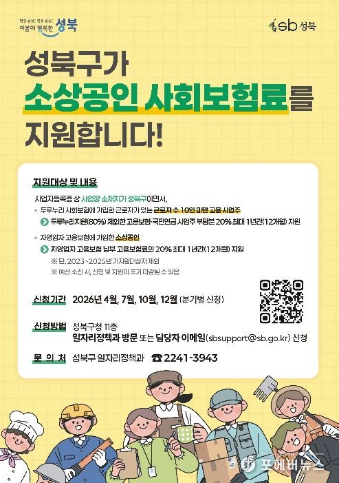 [ 포에버뉴스 김경순 기자 ] 서울 성북구가 4월 13일부터 17일까지 2026년 '성북구 소상공인 사회보험료 지원사업' 1분기 신청 접수를 진행한다.