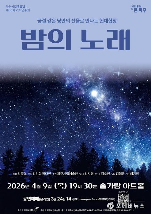 [ 포에버뉴스 김경순 기자 ] 파주시는 파주시립예술단 제85회 기획공연 '밤의 노래'을 오는 4월 9일 19시 30분 솔가람아트홀에서 개최한다.