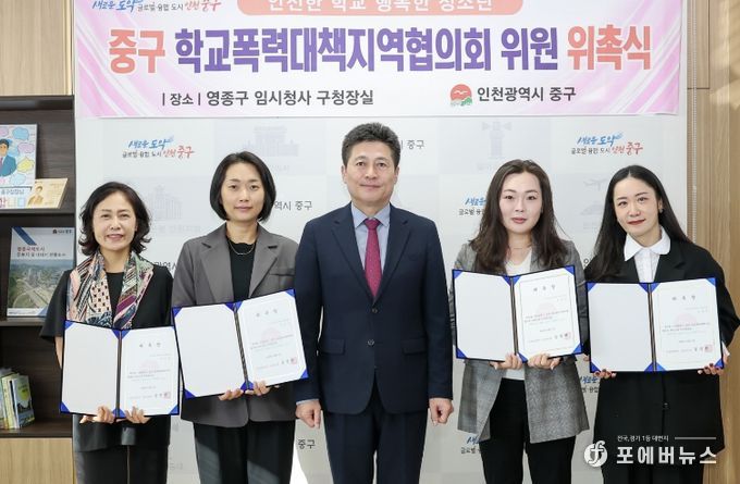 [ 포에버뉴스 김경순 기자 ] 인천시 중구는 ‘학교폭력으로부터 안전한 교육환경 조성’을 위해 ‘학교폭력대책지역협의회’의 신규 위원 4명을 위촉했다고 3일 밝혔다.