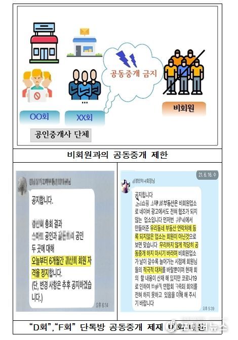 이 단톡방에“공멸하지 않으려면 비회원을 축소·위축시켜야 합니다.”, “D회 총회 결과 공인중개사와 ◇◇공인중개사 2곳에 대해 6개월간 회원자격을 정지합니다.”라는 등 비회원과 공동중개한 회원들을 제재했다.