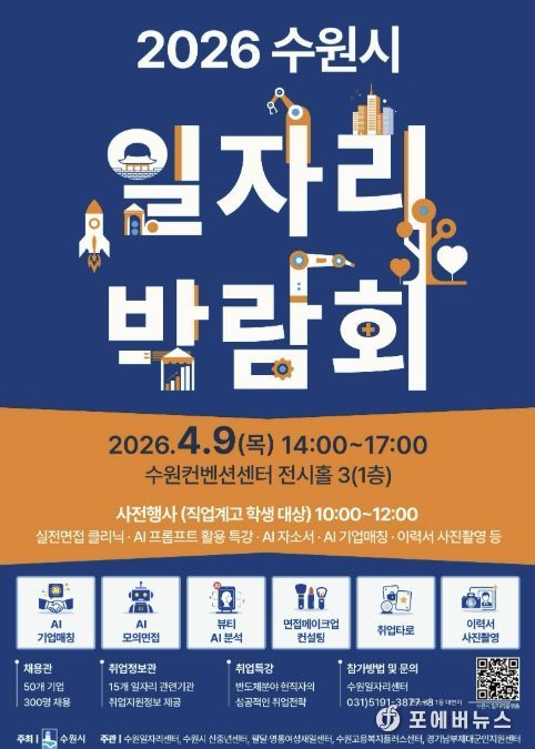[ 포에버뉴스 김경순 기자 ] 수원특례시는 9일 오후 2시부터 5시까지 수원컨벤션센터 전시홀에서 ‘2026 수원시 일자리박람회’를 개최한다.