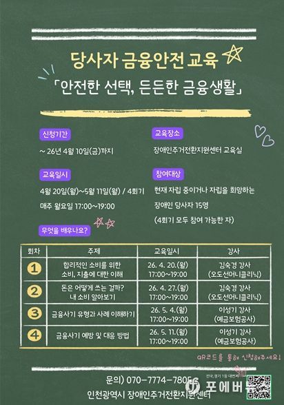[ 포에버뉴스 김경순 기자 ] 인천시사회서비스원 소속 인천시장애인주거전환지원센터는 당사자 금융 안전교육 ‘안전한 선택, 든든한 금융 생활’ 참가자를 모집한다고 6일 밝혔다.