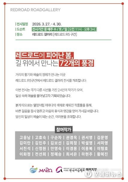 이번 전시는 ‘레드로드에 피어난 봄, 길 위에서 만나는 72개의 풍경’을 주제로 총 24명의 작가가 참여해 회화와 일러스트 등 다양한 작품 72점을 선보인다.