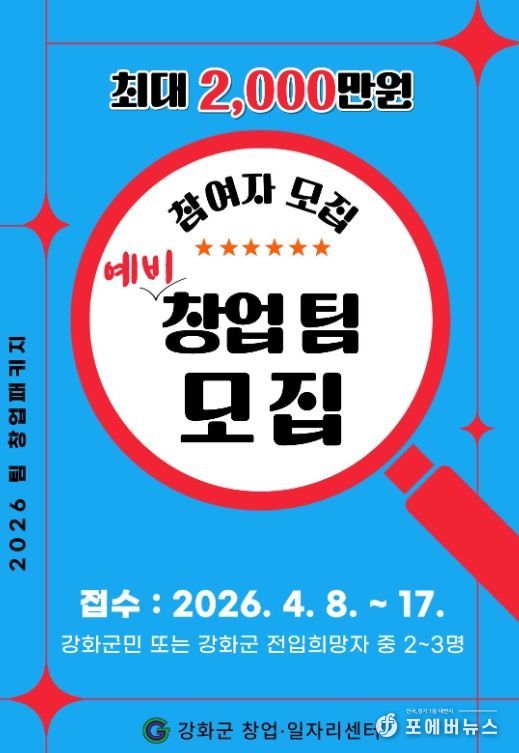 [ 포에버뉴스 김경순 기자 ] 강화군 창업·일자리센터가 '2026년도 팀 창업패키지 지원사업' 참여자를 모집한다.