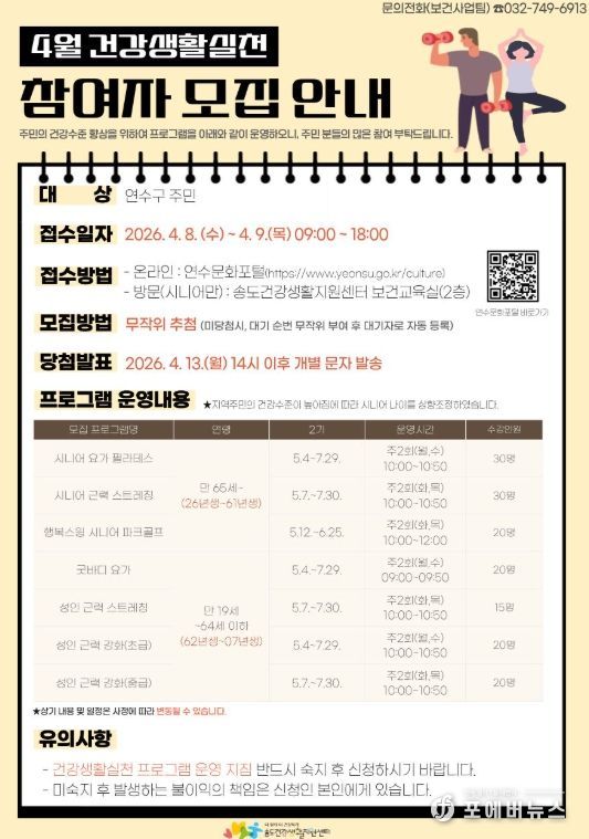 [ 포에버뉴스 김경순 기자 ] 연수구 송도건강생활지원센터는 오는 8일부터 2일간 ‘건강생활실천 프로그램 2기’ 참여자를 모집한다.