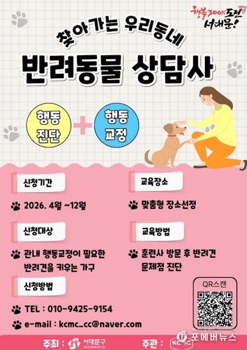 이성헌 서대문구청장은 “반려견의 문제행동은 보호자의 올바른 이해와 꾸준한 관리로 충분히 개선될 수 있다”며 “이번 프로그램이 반려 가정에 실질적인 도움이 되는 계기가 되길 바라고 주민들께서 안심하고 반려동물과 생활하실 수 있는 환경 조성에 더욱 힘쓰겠다”고 말했다.